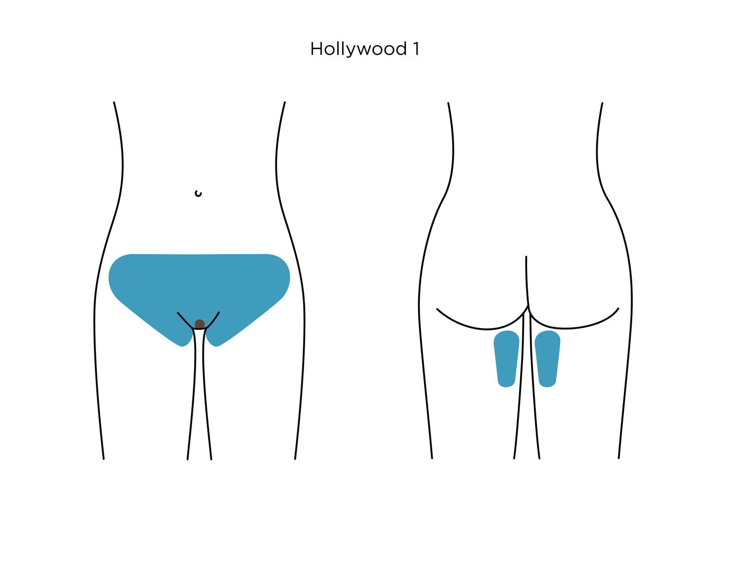 A Hollywood Bikini Wax 1 removes a large portion of hair from the top of the bikini line, as well as the sides of the bikini line, and the vaginal lips. We do not remove hair from the labia or in between the buttocks. A very small patch of hair is left in the front. $65